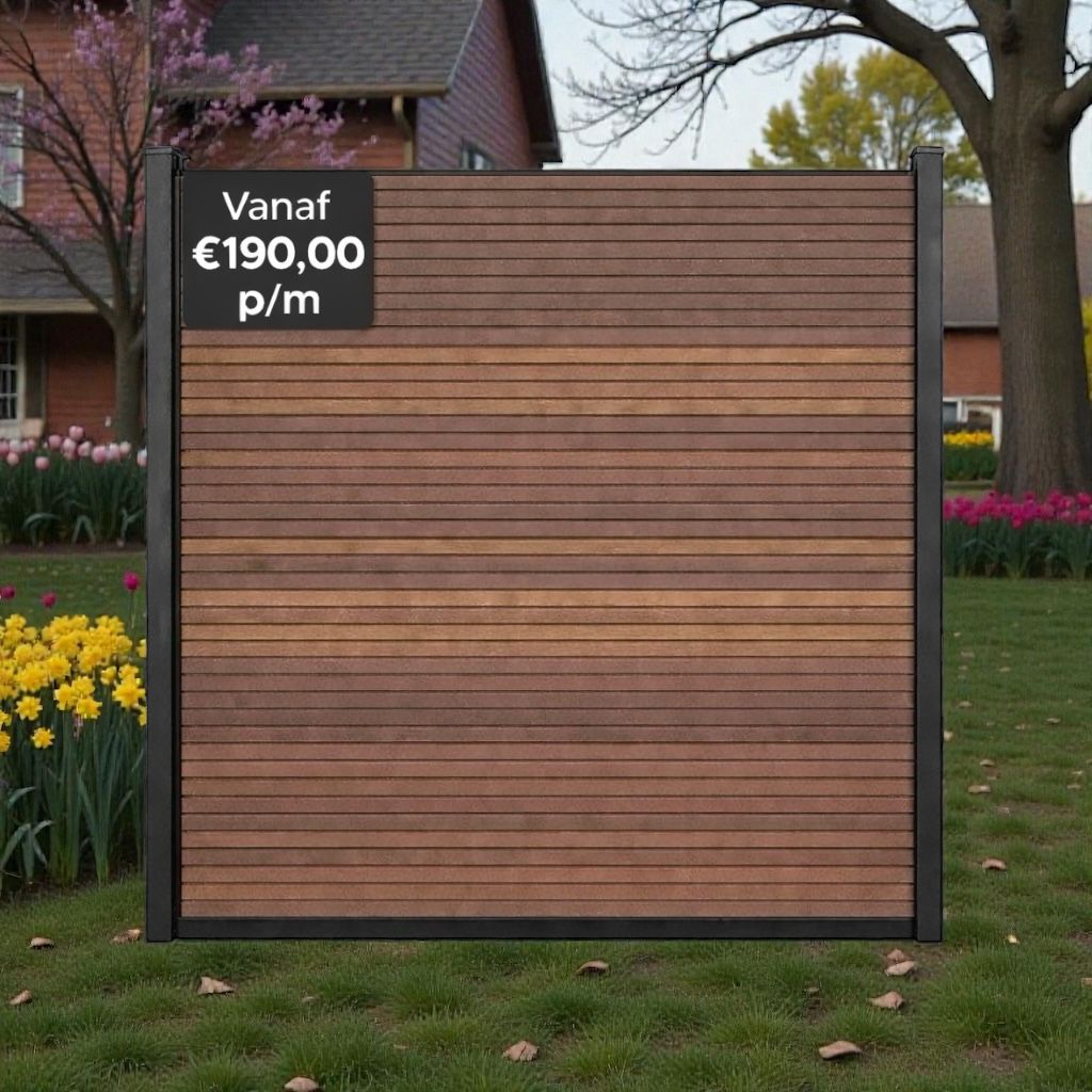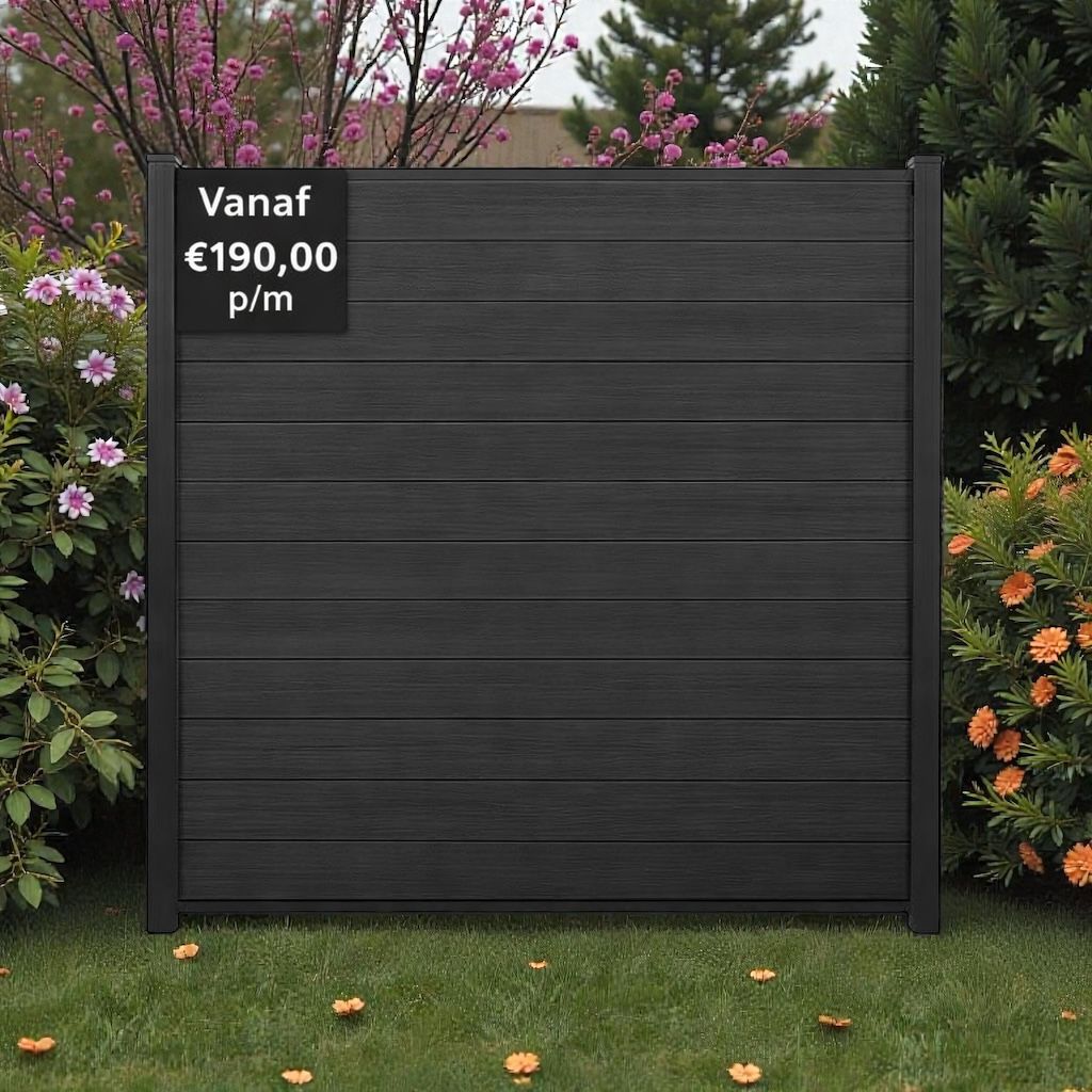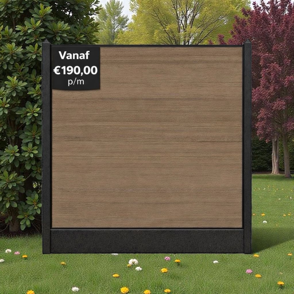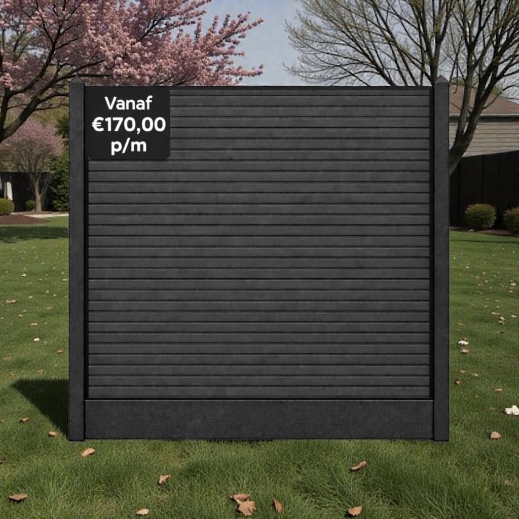 Composiet schermen in verschillende kleuren en houtlooks. Betonnen onderplaten en betonnen palen in meerdere tinten. Verschillende afwerkingen, zoals afdekkappen, profielen en luxe hoek- of eindafwerking.